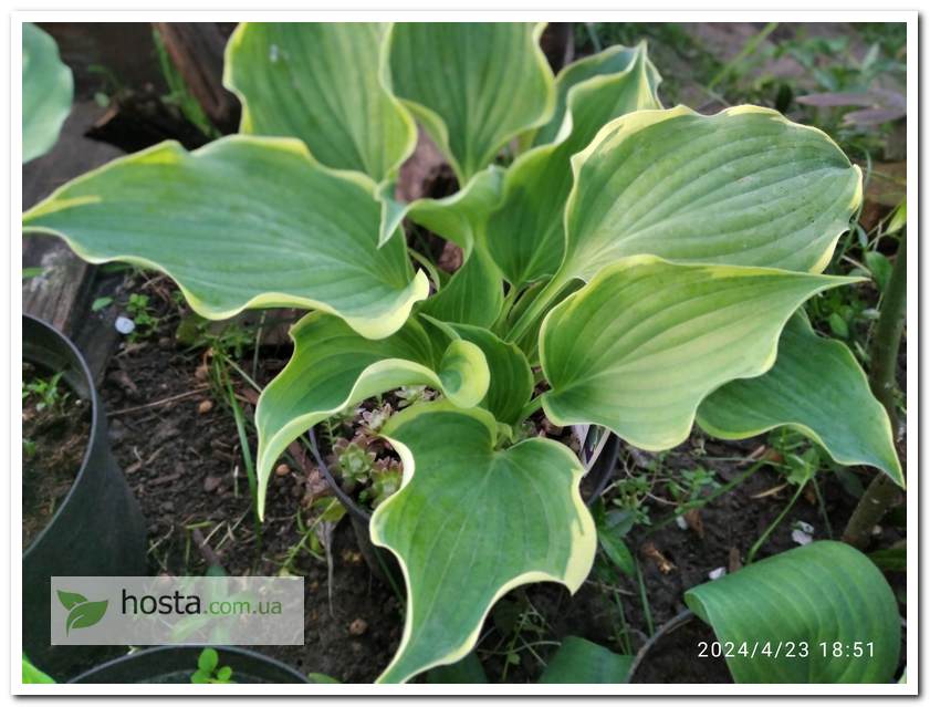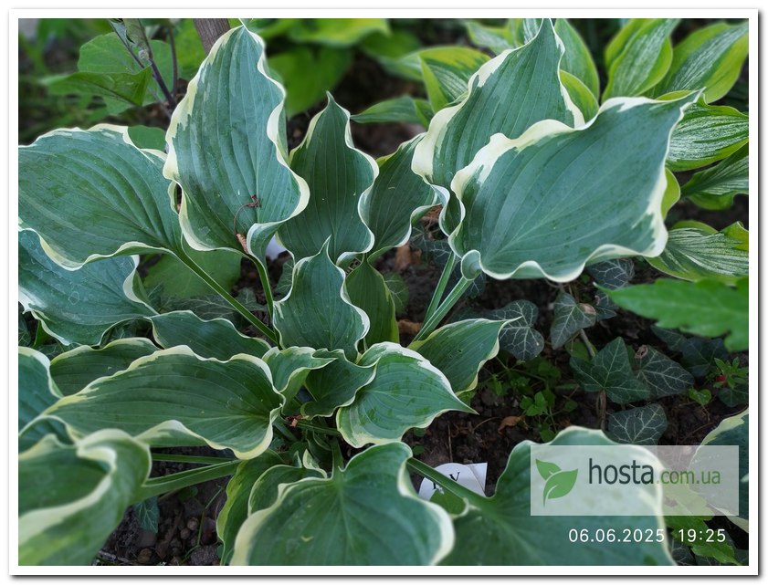 Досить крупна, в дорослому віці кущ має дорости до висоти 50-55 см. Листя синьо-зелене, кольору темної морської хвилі. Гофрований кремовий край, за рахунок якого кущ ніби «танцює». Лист досить щільний, кущ гарно тримає форму і зберігає декоративність до кінця сезону.